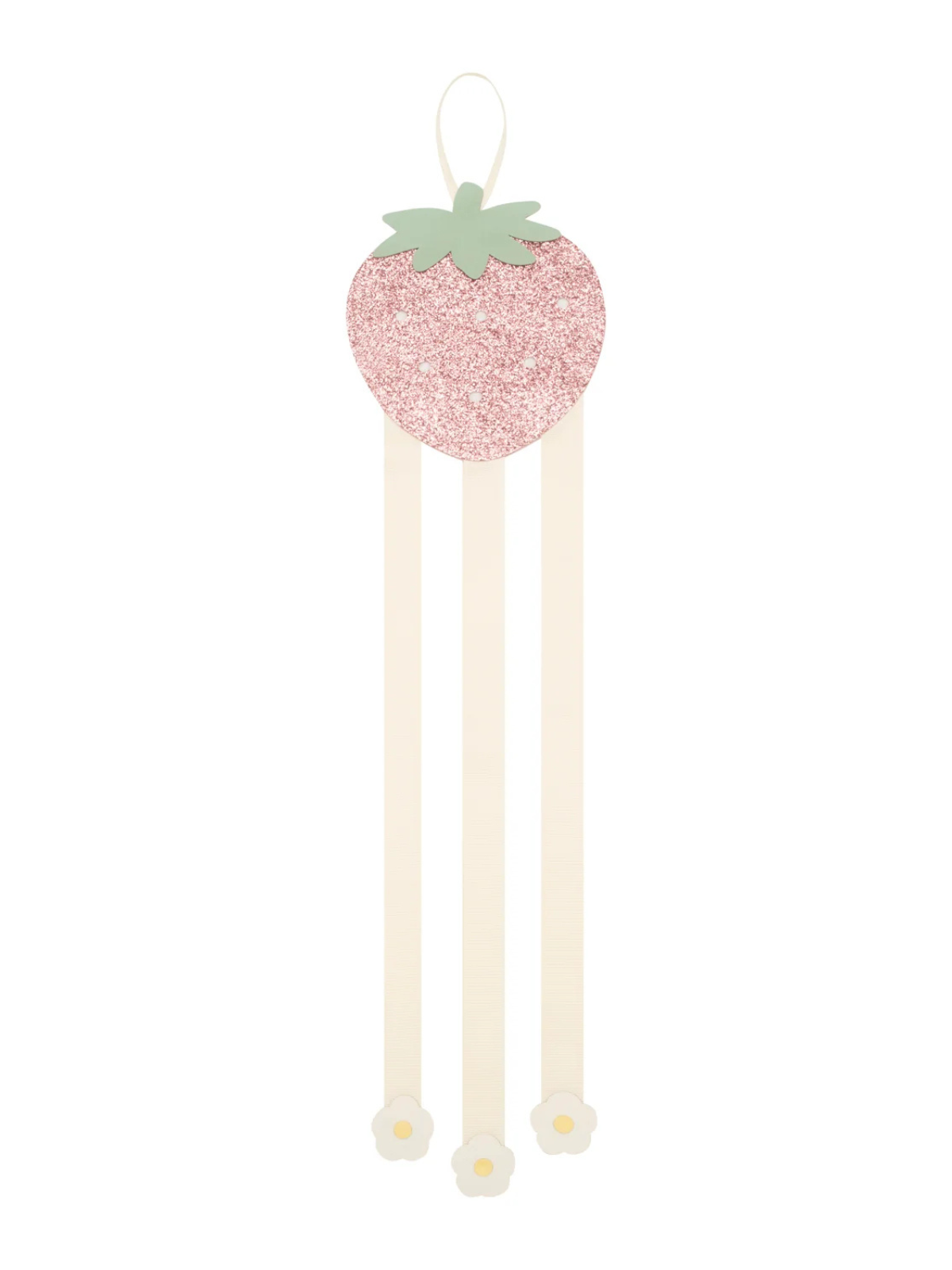 A tidy spot for little favorites. The Sweet Strawberry Ribbon Clip Hanger is designed to keep hair clips neatly stored in one place, finished with a sweet strawberry detail and three hanging ribbon strips. It holds up to approximately 39 clips, depending on size, and hangs easily from a grosgrain ribbon loop.