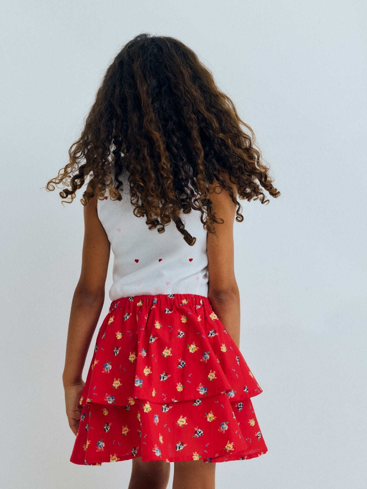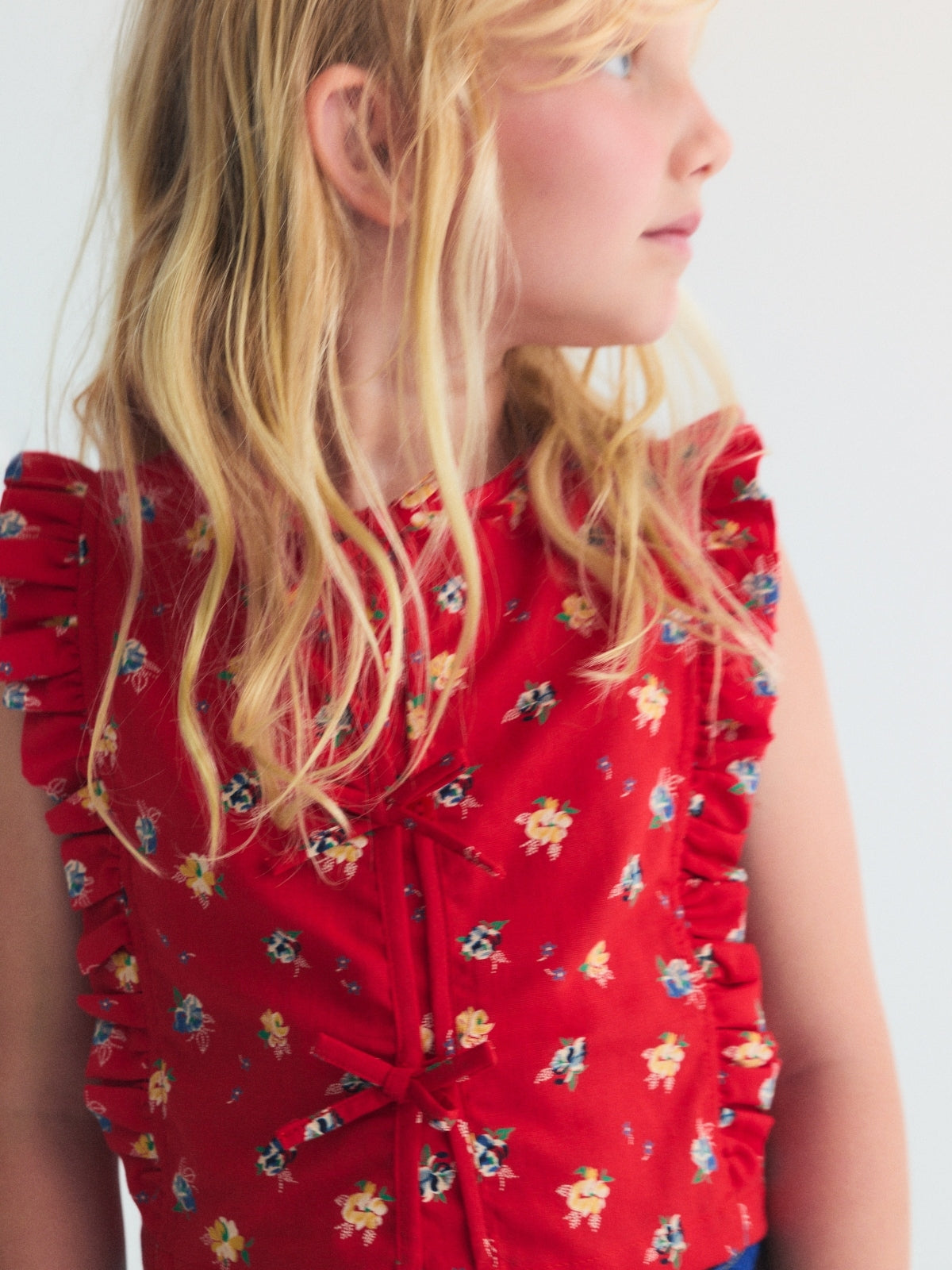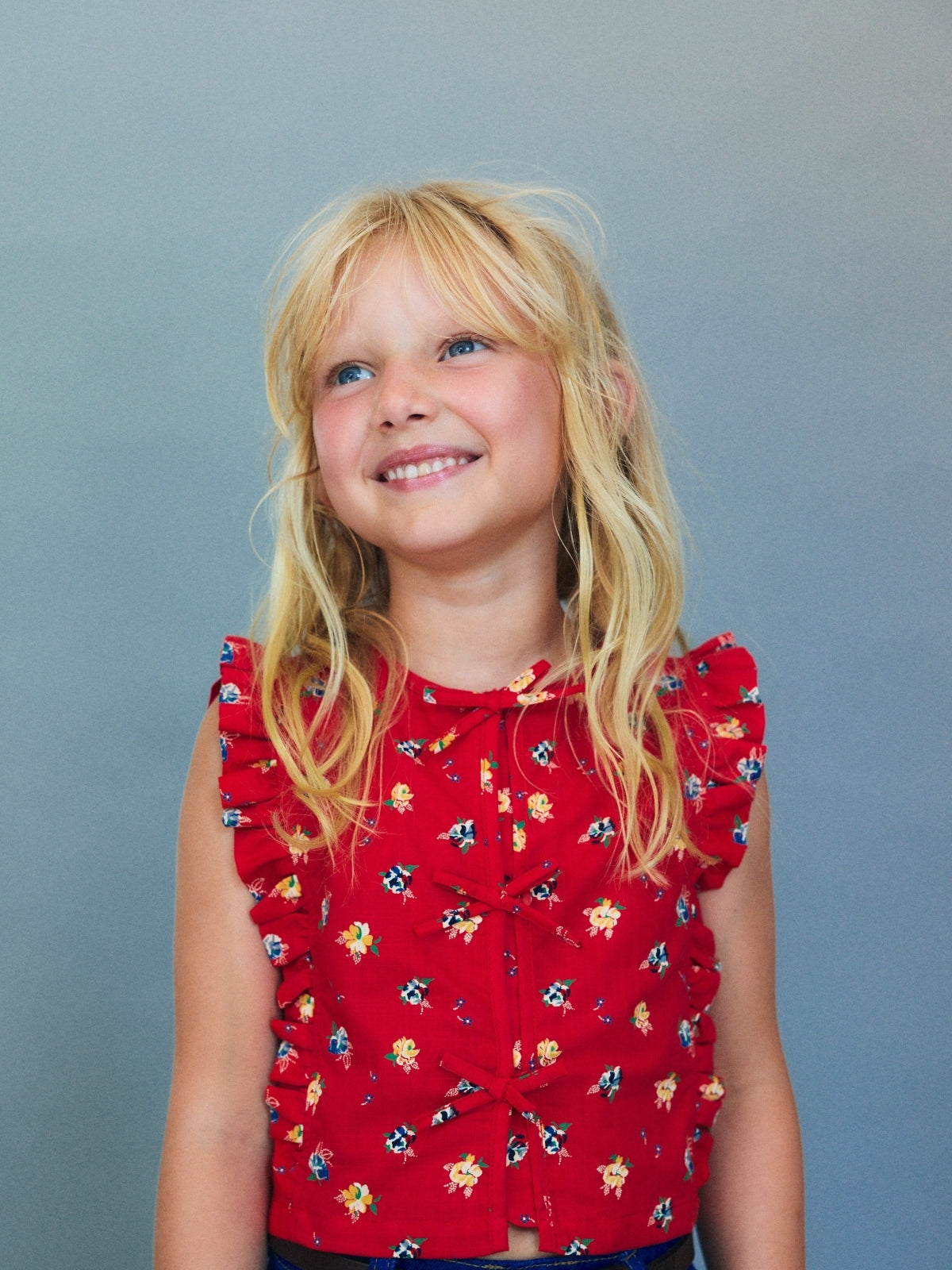 Bright and full of movement, the Amapola Top & Skirt Set pairs a floral-printed cotton top with a coordinating skirt for an effortlessly put-together look. The sleeveless top features front tie closures and soft ruffle detailing, while the matching skirt is finished with an elastic waistband and layered hem for easy, everyday wear.