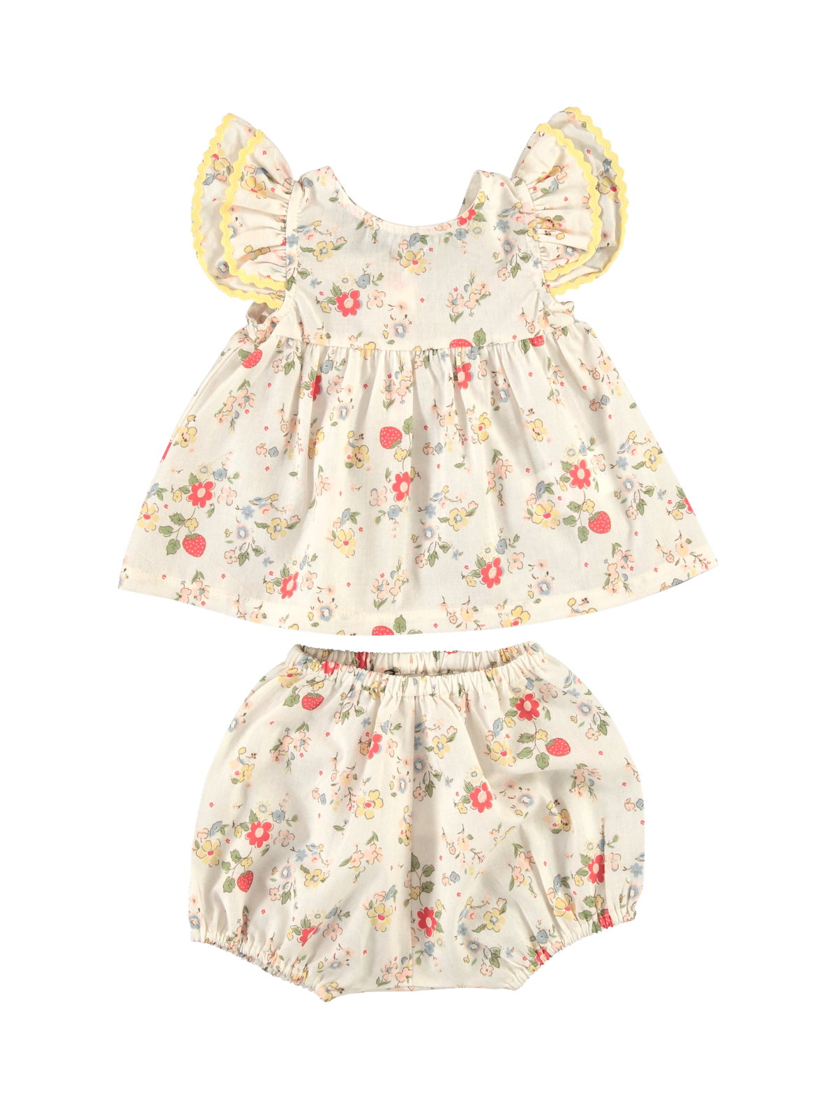 Made for summer days and strawberry play. The Annice Baby Set includes a flutter-sleeve top and matching bloomers, both cut from vintage-inspired organic cotton with an allover strawberry floral print. Finished with yellow scalloped lace and a loose, breezy fit for warm-weather comfort.