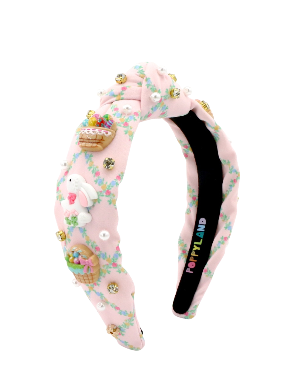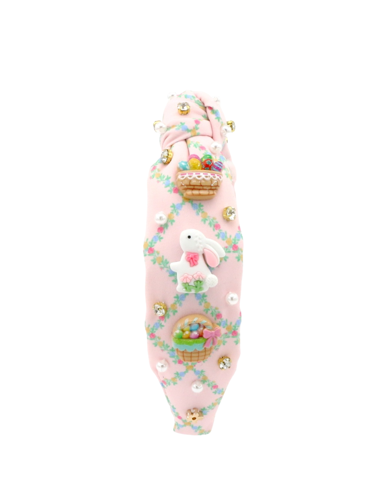 A little garden party for their hair. The Easter Trellis Headband blooms with bunnies, blossoms, easter egg baskets, and springtime sparkle.