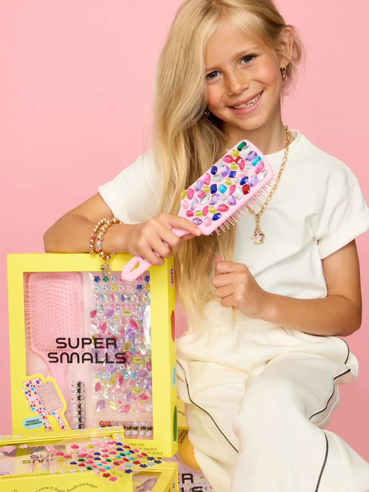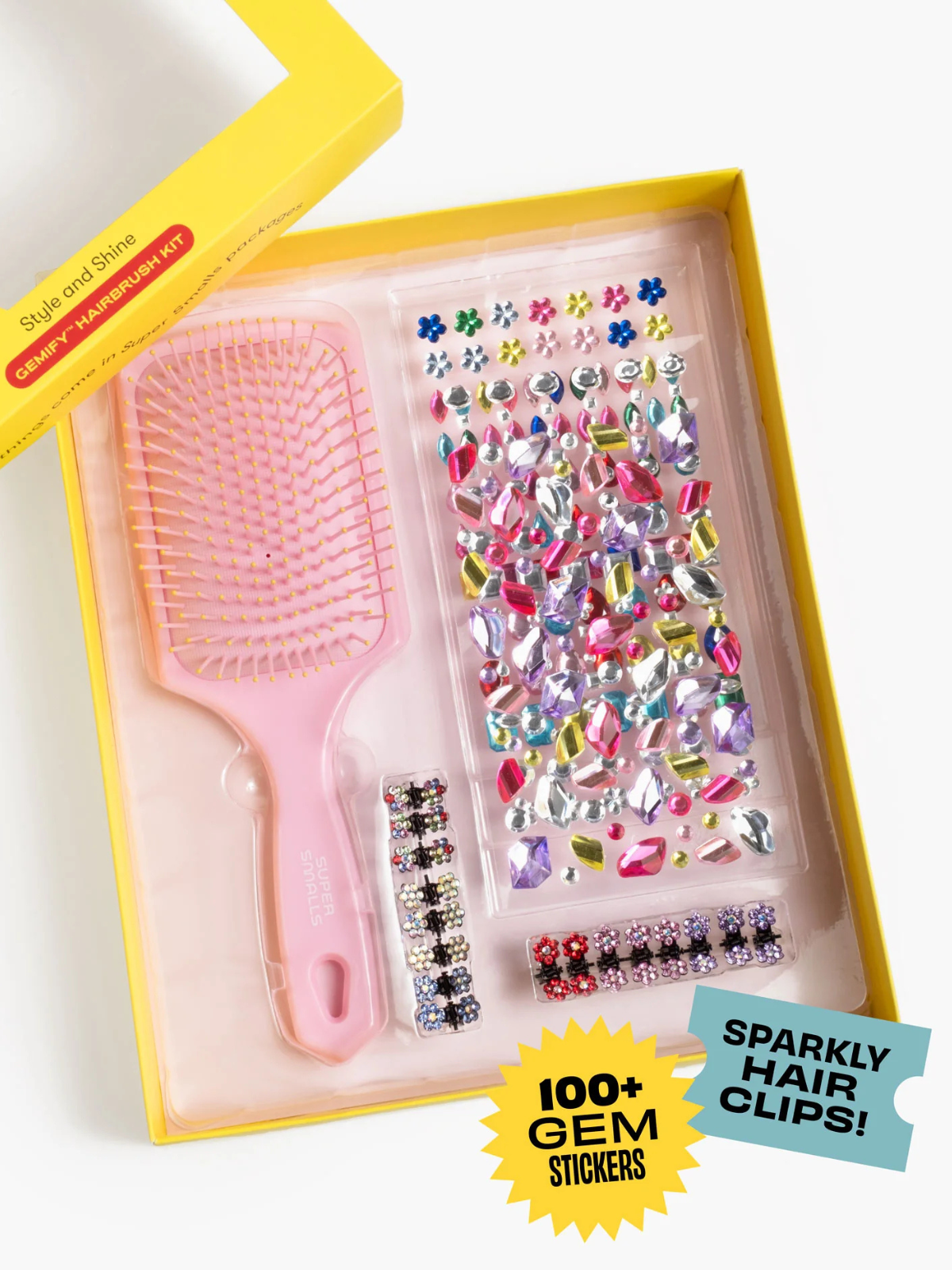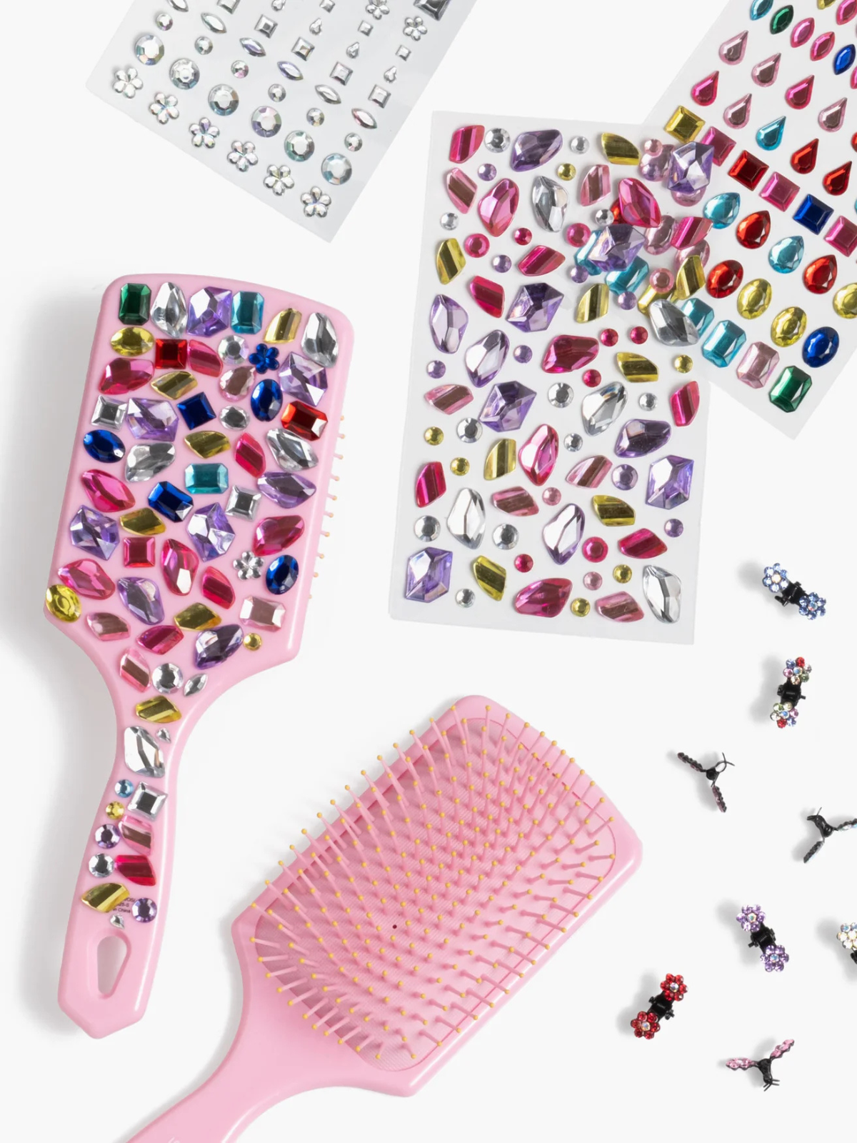 Brushing, but make it fun. The Style & Shine Gemify Hairbrush Kit turns everyday routines into a creative moment with a soft pink brush ready to customize. Three sheets of gem stickers and sparkly flower mini clips let kids decorate, style, and shine all at once, making it equal parts craft project and getting-ready essential.